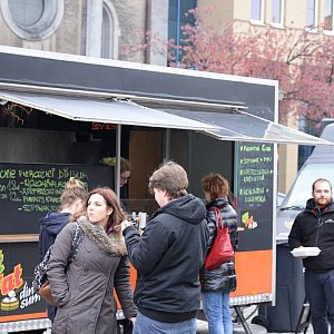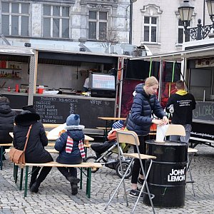 Pogoda trzyma w niepewności i raz za razem płata figle, ale z ciężkich ołowianych chmur póki co nie spadł żaden deszcz. Przynajmniej w tym czasie, gdy otwarte są food trucki, które w piątek zaparkowały na tarnogórskim rynku.