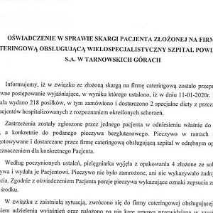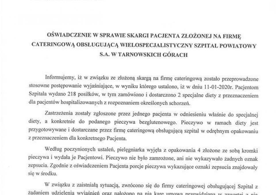 Wielospecjalistyczny Szpital Powiatowy S.A. w Tarnowskich Górach opublikował oświadczenie w sprawie spleśniałego chleba, który podano pacjentowi do zjedzenia. Na firmę cateringową nałożono karę umowną.
