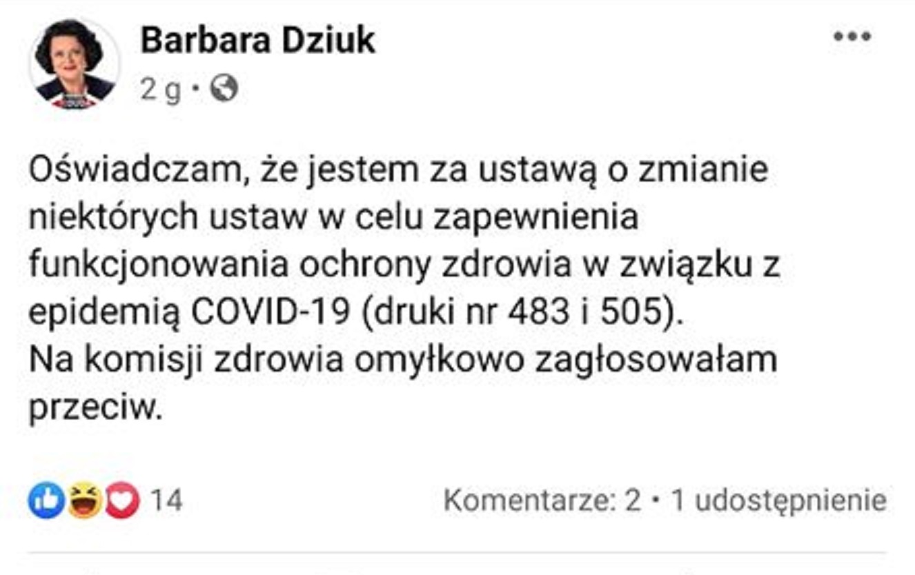 "Oświadczam, że jestem za ustawą o zmianie niektórych ustaw w celu zapewnienia funkcjonowania ochrony zdrowia w związku z epidemią COVID-19 (druki nr 483 i 505). Na komisji zdrowia omyłkowo zagłosowałam przeciw" – napisała w mediach społecznościowych.