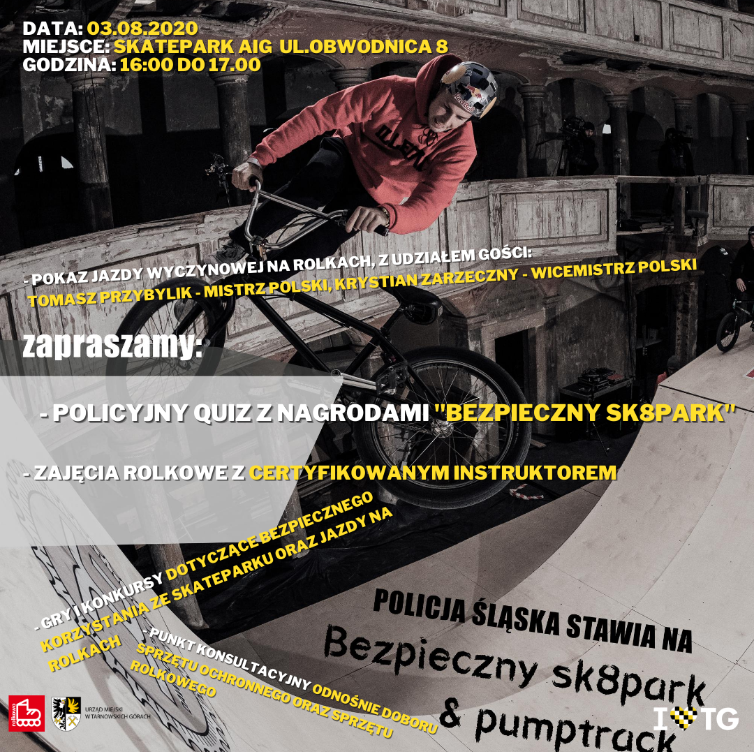 Policja organizuje tam akcję „Bezpieczny sk8park&pumptrack”, 3 sierpnia w godz. 16-17. W programie policyjny quiz z nagrodami, pokaz jazdy wyczynowej na rolkach w wykonaniu mistrza Polski Tomasza Przybylika i wicemistrza Krystiana Zarzecznego, zajęcia rolkowe z certyfikowanym instruktorem, gry i zabawy, punkt konsultacyjny dotyczący doboru rolek i sprzętu ochronnego.