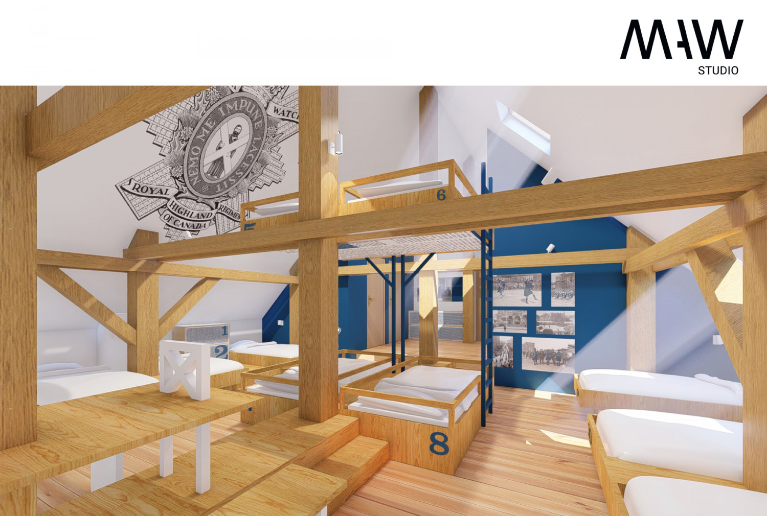 - Największy pokój w hostelu, 12-osobowy, urządziliśmy w wojskowym stylu. To nawiązanie do oficerów z II batalionu szkockiego pułku Black Watch (Czarna Straż), którzy w naszym budynku mieli swą mesę i klub oficerski - wyjaśnia Mariusz Gąsior, kustosz zbiorów w Stowarzyszeniu Miłośników Ziemi Tarnogórskiej i dodaje: na ścianach sali znajdziemy również archiwalne zdjęcia szkockich żołnierzy z czasu ich służby w Tarnowskich Górach, artykuły z pułkowej gazety z tego okresu oraz odznakę pułku, opartą na motywie krzyża św. Andrzeja.