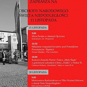 W Radzionkowie 11 listopada o godz. 18 w CK Karolinka wystąpi zespół Mały Śląski i chór Halka. Bilety kosztują 20 zł. Z kolei w Piekarach Śląskich 12 listopada z koncertem niepodległościowym wystąpi Mieczysław Szcześniak i Orkiestra Wojskowa z Bytomia.