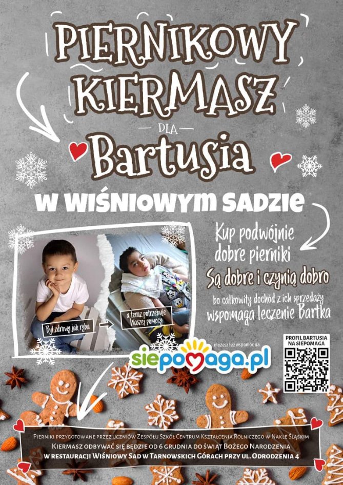 Jutro, 6 grudnia w restauracji Wiśniowy Sad w Tarnowskich Górach rusza piernikowy kiermasz dla Bartusia. Aż do świąt będzie można kupić pierniki przygotowane przez uczniów Zespołu Szkół Centrum Kształcenia Rolniczego w Nakle Śląskim.