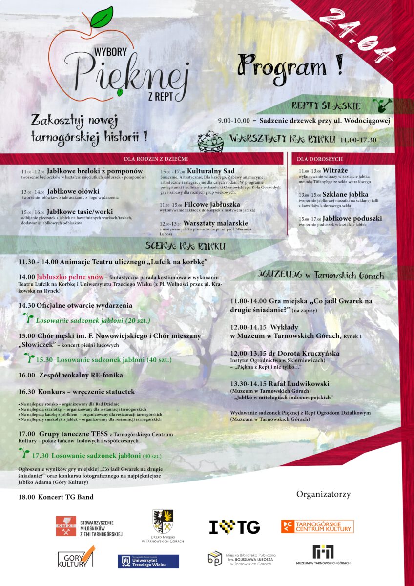 W niedzielę, 24 kwietnia na Rynku i w centrum miasta pojawią się stoiska rad dzielnic i tarnogórskich stowarzyszeń, których motywem przewodnim będą jabłka. Wśród atrakcji znajdą się ciasta, jabłkowe przetwory, gry, zabawy i wszystko, co ma związek z jabłkiem. Od rana odbywać będą warsztaty, gra miejska, wykłady, wystąpi teatr uliczny "Lufcik na Korbkę". Wszystko utrzymane będzie w klimacie belle epoque. Na scenie zaśpiewają chóry i zespoły z Rept Śląskich, a kulminacją będzie koncert Tarnogórskiego Big Bandu.