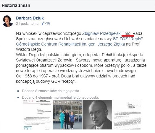 Wnioskowali o nią radny wojewódzki Zbigniew Przedpełski i Barbara Dziuk, która chwaliła się tym w mediach społecznościowych. Po lawinie krytycznych komentarzy post został zmieniony. Publikujemy wersję przed edycją:
