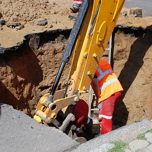 W zapadlisku zbiera się woda z pękniętej rury. Pracownicy Veolii próbują opanować awarię.