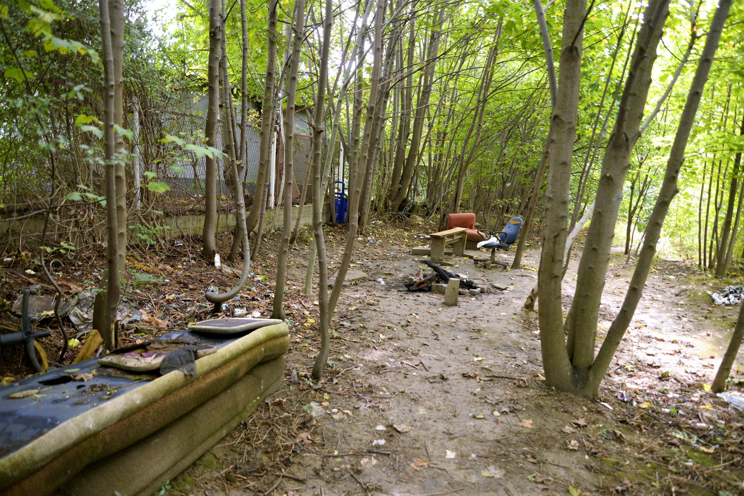 Pomiędzy skarpą a płotem zakładu wylęgu drobiu jest szeroki na kilka metrów nieużytek porośnięty drzewami i krzakami. Teren jest często odwiedzany, o czym świadczą walające się wszędzie puszki, butelki i inne śmieci. Są przetarte ścieżki, ktoś tu koczuje, jest stara wersalka, fotele, ślady palenia ogniska.