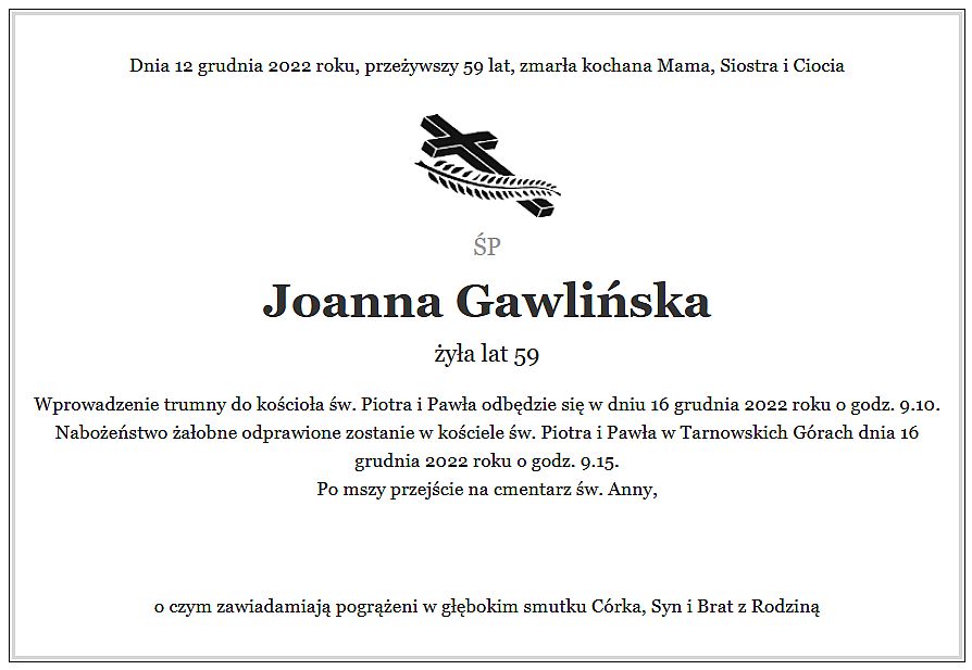 Joanna Gawlińska zmarła 12 grudnia w wieku 59 lat.