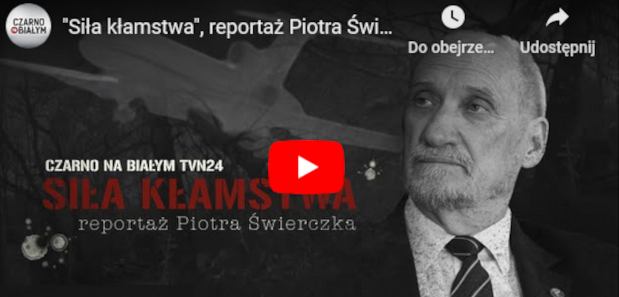 Reportaż "Siła kłamstwa" to efekt wielomiesięcznej pracy dziennikarza "Czarno na białym" TVN24 Piotra Świerczka. Materiał dotyczy katastrofy w Smoleńsku w 2010 r.
