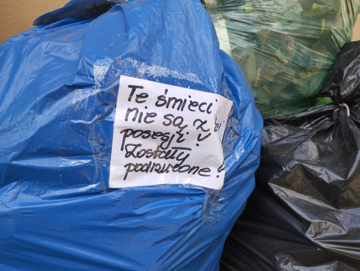 Na jednym z worków ktoś nakleił kartkę z informacją: "Te śmieci nie są z tej posesji. Zostały podrzucone".