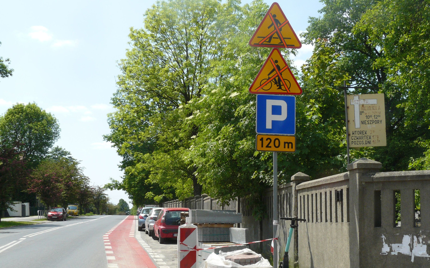 Jednak już kawałek dalej, za wejściem do kościoła i na cmentarz, są miejsca parkingowe, dokładnie na długości 120 m. Pas dla rowerzystów biegnie wzdłuż nich i spokojnie można tam zostawić samochód.