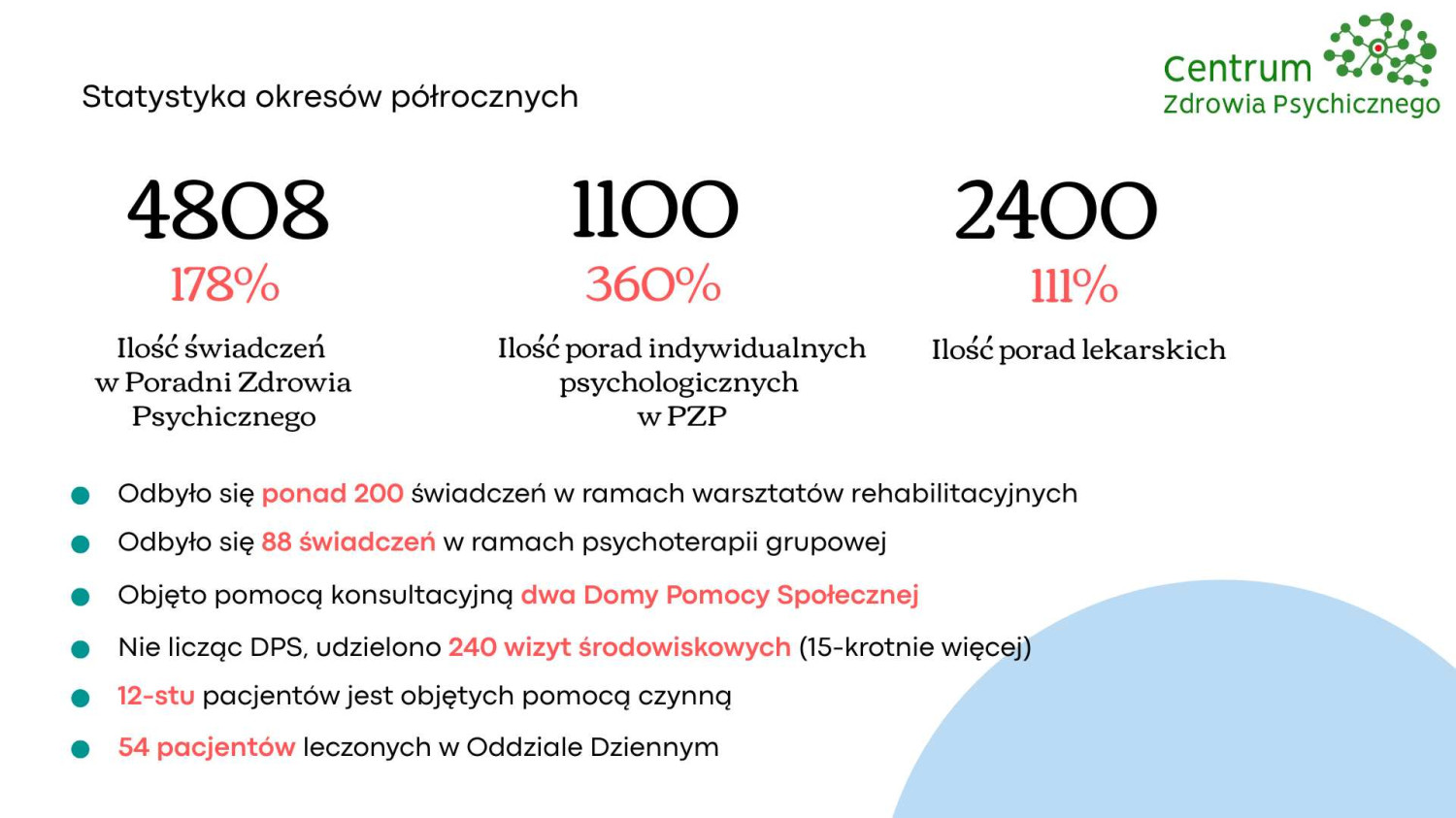 Ponadto, jako dopełnienie oferty CZP wykonano 200 świadczeń w ramach warsztatów rehabilitacyjnych, 88 świadczeń w ramach psychoterapii grupowej, odbyło się 240 wizyt środowiskowych.