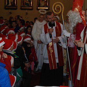 - Co św. Mikołaj najbardziej lubi jeść? - zapytały dzieci. — Nie jestem wybredny — odpowiedział gość. — To, co mu chóry anielskie podadzą — dorzucił ks. proboszcz Eugeniusz Bil. — Roladę i kluski śląskie — odpowiedziały chóry, czyli przebrane za anioły mamy niektórych dzieci zebranych w kościele. Kiedy chwilę później przyszedł czas na rozdawanie paczek, mamy-anioły odsłoniły kilka koszy i w ciągu paru minut każde z dzieci trzymało w rękach podarek, a w nim słodycze, przybory szkolne itd.