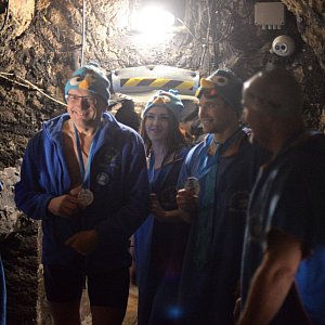 Teraz trwają zmagania na krótszych dystansach. Pływacy mają do pokonania najpierw 30 metrów w dół po krętych schodach szybu Sylwester. Potem indywidualnie przepływają zadeklarowane 25, 50 lub 100 metrów. Styl dowolny, nie są to zawody na czas. Połowę dystansu pokonują z prądem wody, drugą część wracają na pomost szybu. Tu przybicie "piątki" i kolejny zawodnik podziemnej sztafety rozpoczyna pływacką przygodę w wodach sztolni.