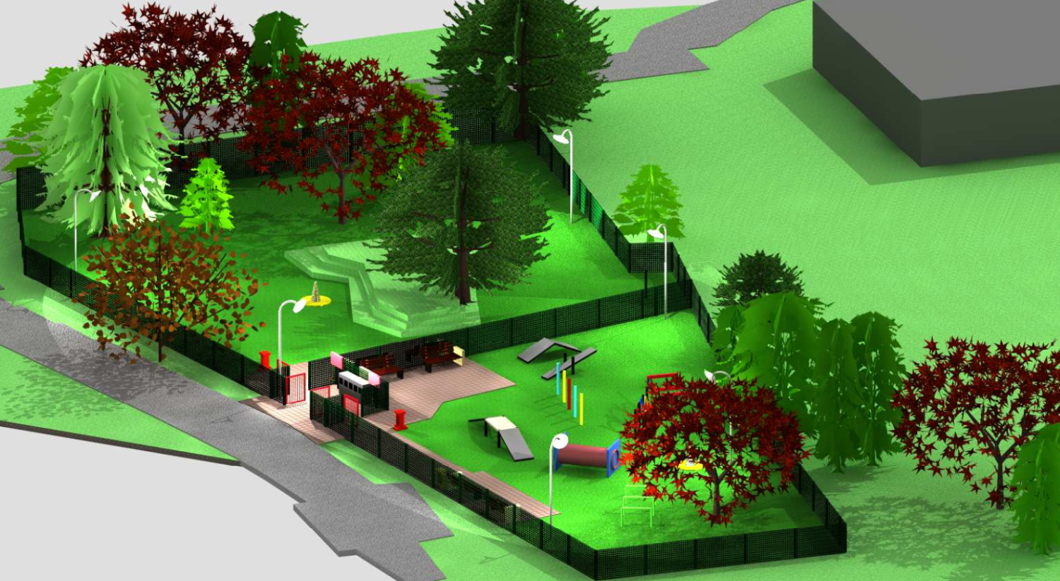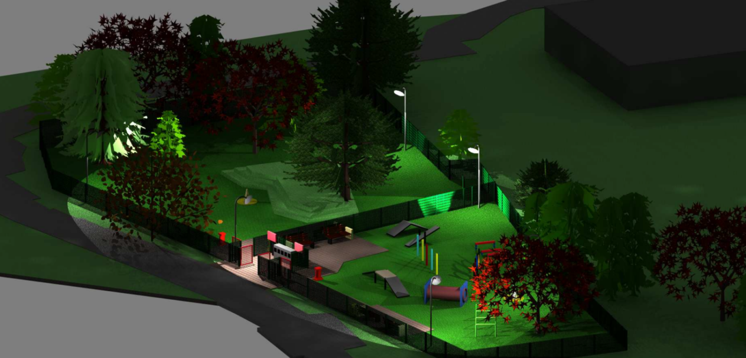 W planach jest wykonanie ogrodzenia raz terenu utwardzonego kostką brukową, montaż urządzeń dla psów w strefie agility – 8 przeszkód (kładka, równoważnia, tunel, obręcz do skoków, szałas, słupki do slalomu, drążki do skoków, tor z rurek), 6 lamp solarnych, ławek, koszy i tablic.