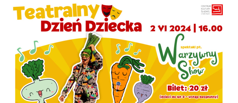 Teatralny Dzień Dziecka "Warzywny Show" to propozycja Centrum Kultury Śląskiej w Nakle Śląskim – 2 czerwca o godz. 16. Na scenie wystąpią Burak Zenon, Ziemniak Andrzej, Pan Brukselka czy Kapusta Jolanta. Do tego dochodzą warsztaty i animacje teatralne oraz warsztaty chemiczne. Wstęp – 20 zł.
