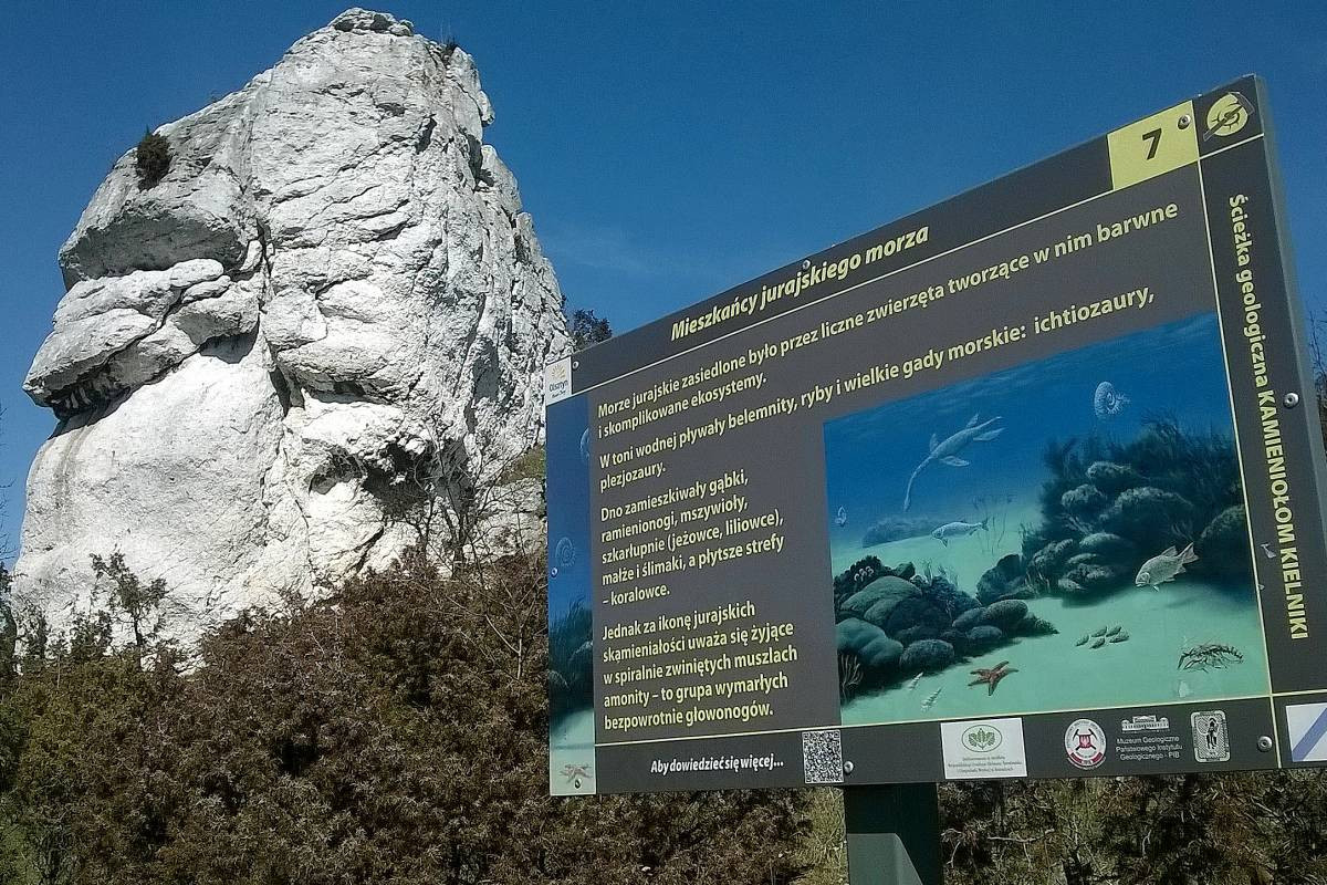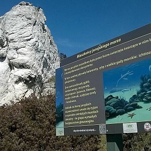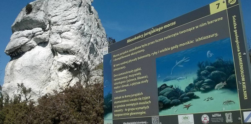 Kolejna mijana na ścieżce tablica przedstawia organizmy, które zamieszkiwały morze, istniejące na tym terenie w okresie jury. Ten region Polski kojarzony jest z amonitami, ale żyły tu także rozpalające wyobraźnię ichtiozaury i plejozaury.