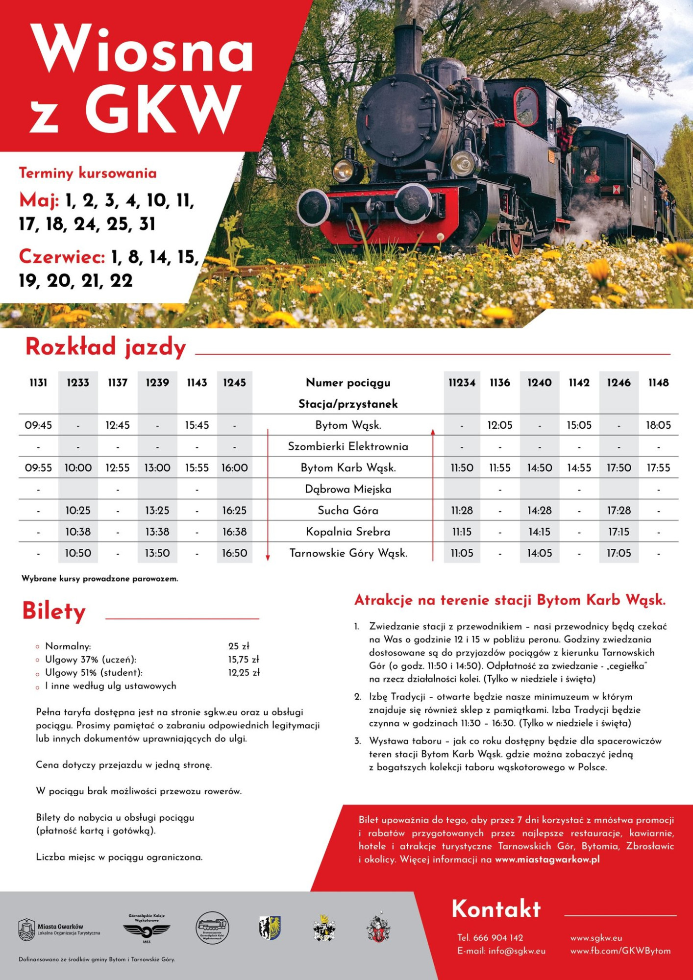 Na trasę wyjadą 3 pary pociągów, w niedziele i święta będzie możliwość zwiedzania stacji Bytom Karb Wąskotorowy z przewodnikiem, Izby Tradycji i wystawy taboru.