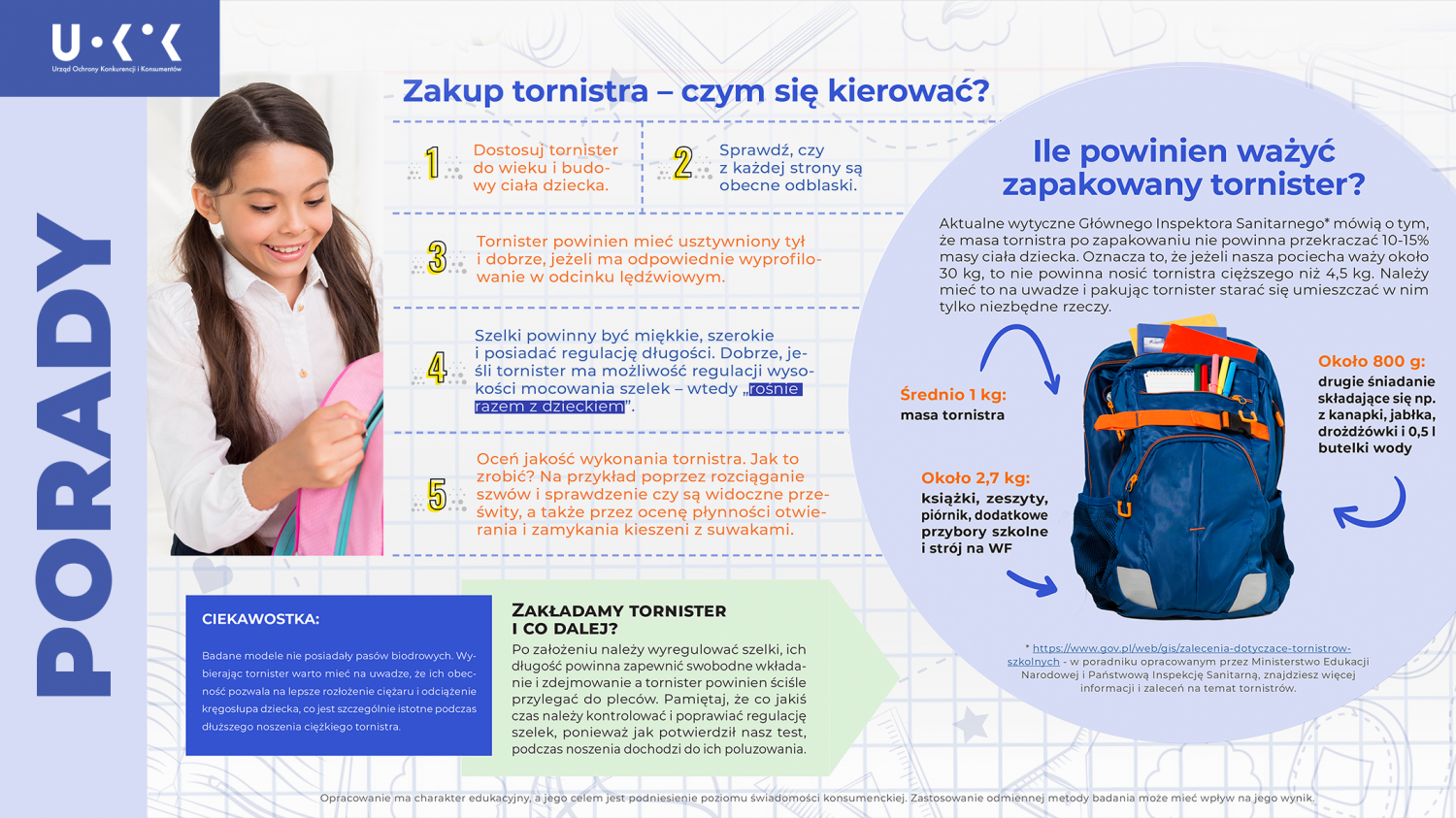 - Tornister to podstawowy punkt na liście wyprawki szkolnej. Przy wyborze warto zwrócić uwagę na jego funkcjonalność, wytrzymałość oraz przede wszystkim bezpieczeństwo dla kręgosłupa dziecka – wyjaśnia prezes UOKiK Tomasz Chróstny.