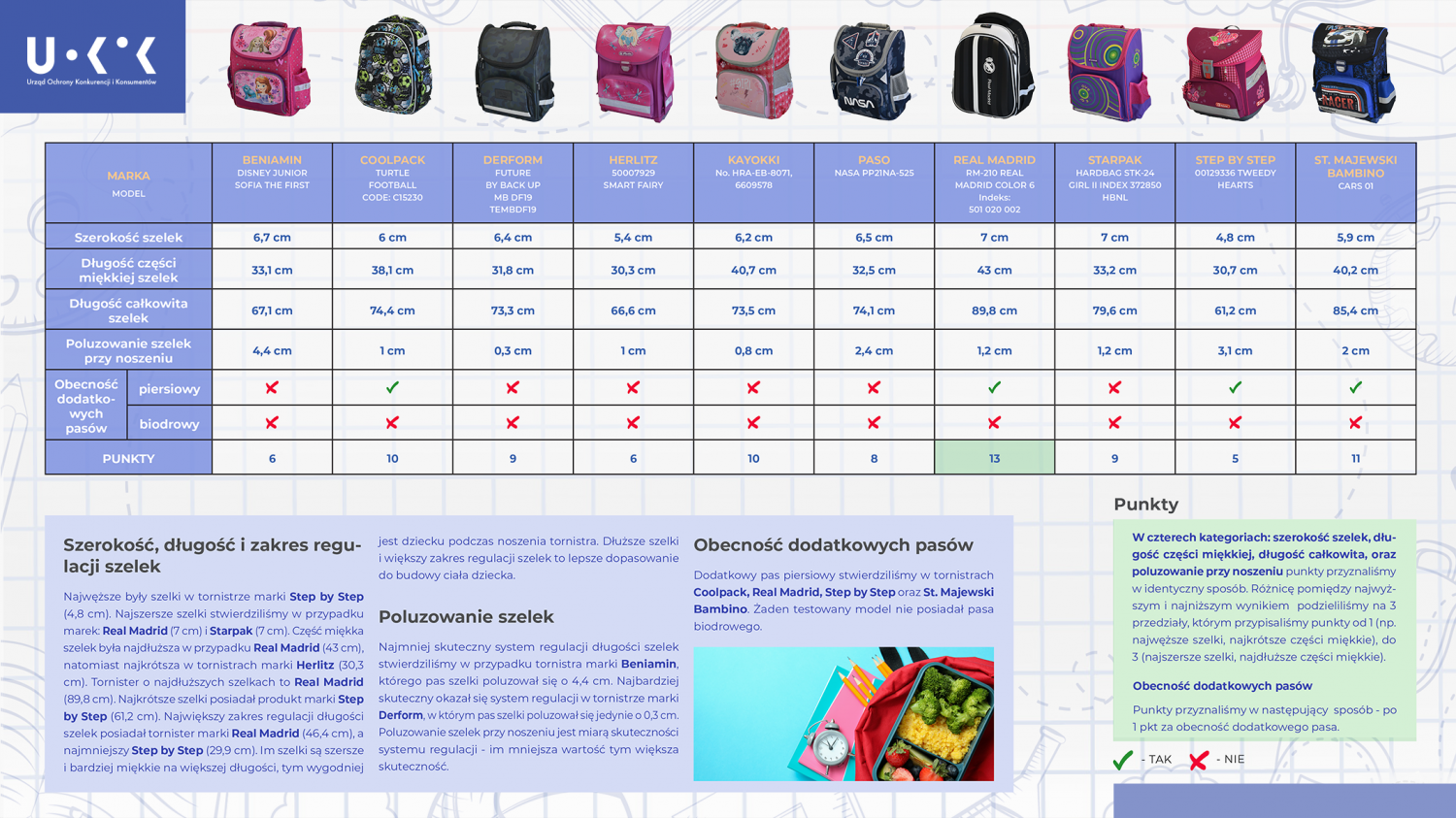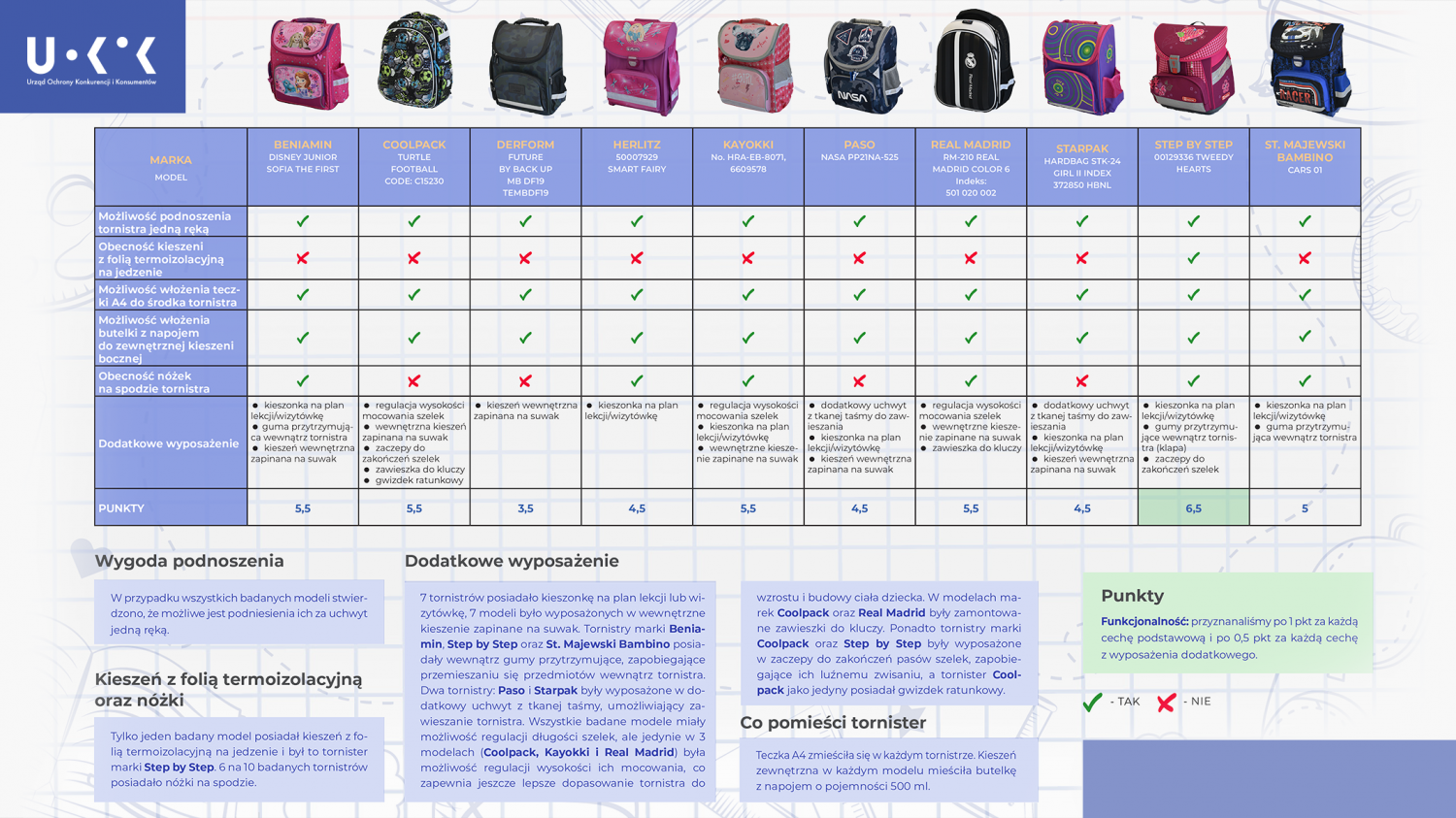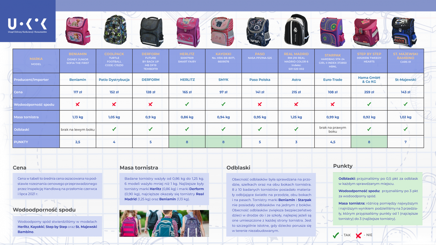 Specjaliści z laboratorium UOKiK ocenili tornistry pod kątem obecności odblasków, funkcjonalności i wytrzymałości. Sprawdzili też, ile waży każdy model i czy spody tą wodoodporne.