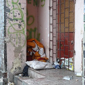 Przy jednym z wejść, kiedyś do sklepu, urzędują menele – są ich rzeczy, mnóstwo śmieci i taki smród, że nawet będąc na zewnątrz, trudno się oddycha.