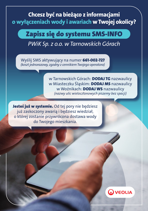 PWiK w Tarnowskich Górach oferuje mieszkańcom bezpłatną usługę SMS-info. Wystarczy się zarejestrować, by otrzymywać powiadomienia o planowanych przerwach w dostawie wody i nagłych awariach – dokładnie z tego rejonu, w którym mieszkasz.