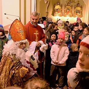 Czymkolwiek zresztą św. Mikołaj by nie przyjechał, zawsze jest mile widzianym gościem. Nie inaczej było tym razem, w kościele czekało na biskupa bardzo dużo dzieci. Św. Mikołaj wszedł w asyście orkiestry górniczej i Małego Śląska. Powitał go proboszcz ks. Eugeniusz Bill.