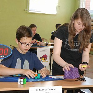 W gimnazjum zawodnicy układali kostki: klasyczną czyli 3x3x3, mniejszą - 2x2x2, oraz pyraminx w kształcie piramidy. W kategorii przedszkolaków i uczniów klas I-III w 2x2x2 najlepszy był Jakub Gruszka (SP10) ze średnim czasem 2,49 s, drugi Jakub Piórkowski (Maków Podhalański), a trzecia Lena Janecka (SP10). W 3x3x3 miejscami zamienili się Jakub Piórkowski i Jakub Gruszka, a trzecia była Kamila Wylenżek (SP10). Z ułożeniem pyraminksa najszybciej poradzili sobie Gruszka, Wylenżek i Janecka.