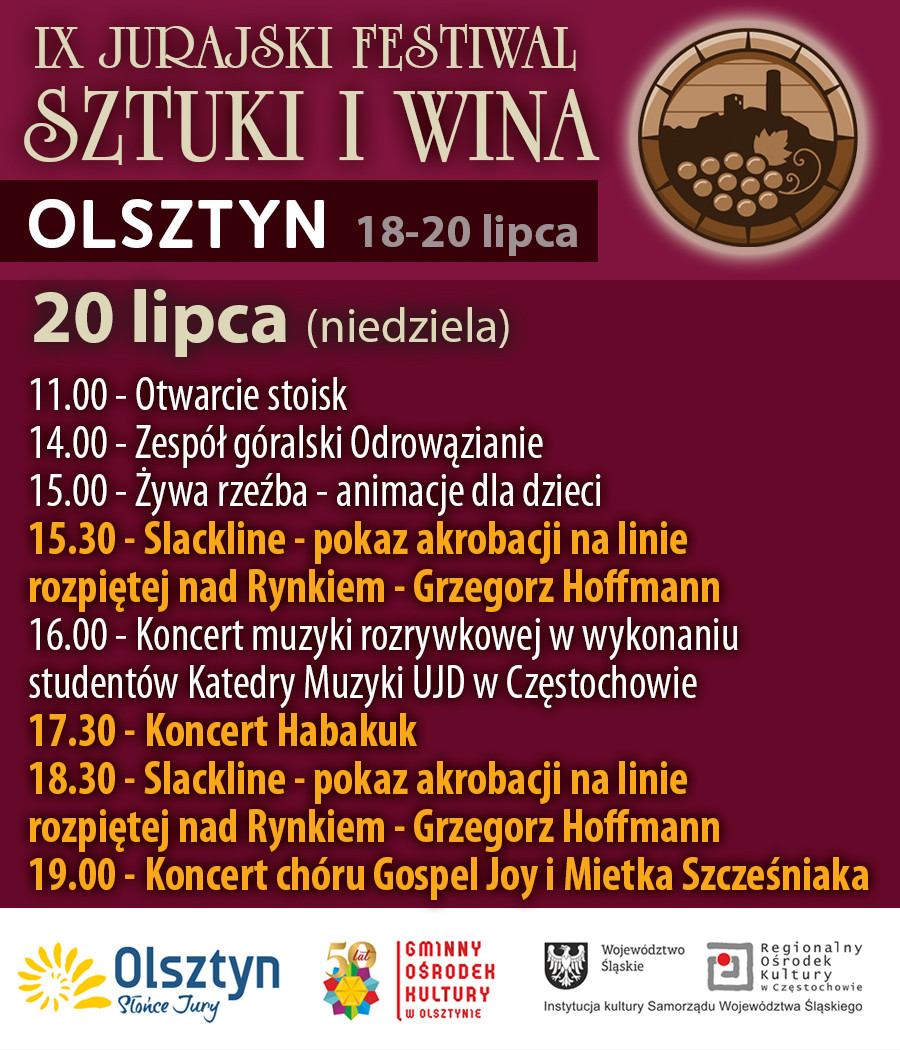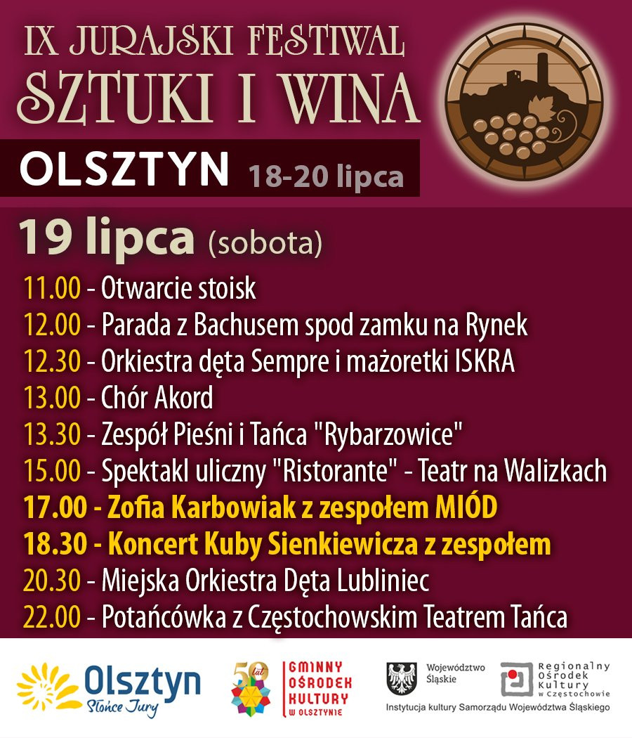 Od piątku trwa Jurajski Festiwal Sztuki i Wina. Gmina Olsztyn zaprasza także w sobotę i niedzielę. W programie koncerty, degustacje, animacje. Szczegóły na plakatach.