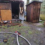W drewnianym garażu stał osobowy peugeot i butle z propan butanem. Strażacy wypchnęli auto na zewnątrz, wynieśli też butle i schładzali je.