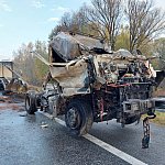 Bmw zderzyło się z ciężarowym renault z naczepą, jadącym równolegle skrajnym prawym pasem.
