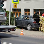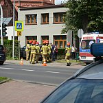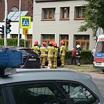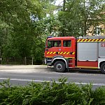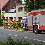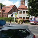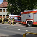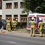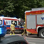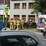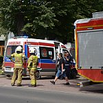 Trzy wozy straży pożarnej policja i karetka pogotowia.