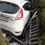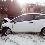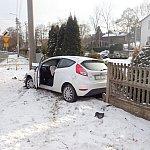 Na zakręcie wpadł w poślizg, po czym uderzył w słup i staranował część ogrodzenia posesji.
