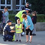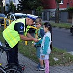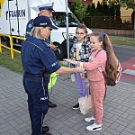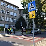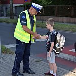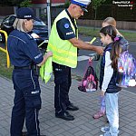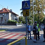 Podczas akcji przy przejściach dla pieszych przy Szkole Podstawowej nr 3 policjanci rozdawali uczniom odblaski, a najmłodszym dzieciom - kamizelki odblaskowe.