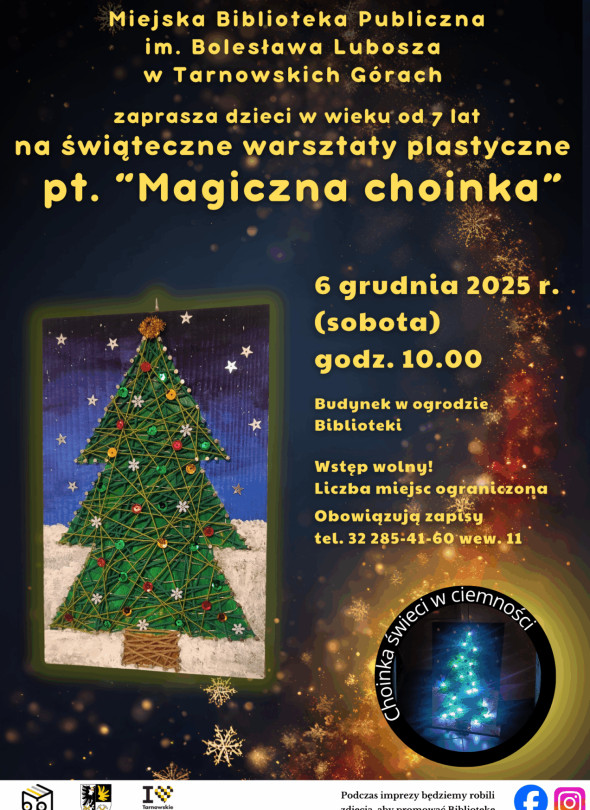 6 grudnia o godz. 10 Miejska Biblioteka Publiczna w Tarnowskich Górach zaprasza dzieci od 7 lat na warsztaty plastyczne „Magiczna choinka”. Wstęp wolny, ale są zapisy – tel. 32-285-41-60 w. 11. Zajęcia będą w budynku w ogrodzie biblioteki.
