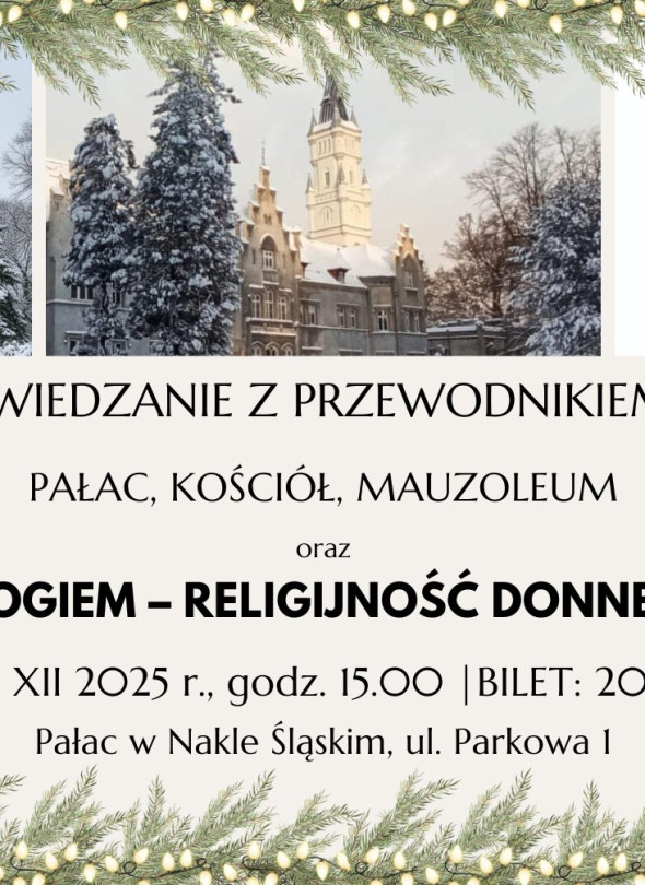 15:00 – zbiórka Pałac hrabiów Henckel von Donnersmarck, ul. Parkowa 1 przejście do kościoła i mauzoleum powrót do pałacu i zwiedzanie ok. 16:30 – prelekcja „Z Bogiem – religijność Donnersmarcków” świąteczny poczęstunek w Pałacowej Kawiarence