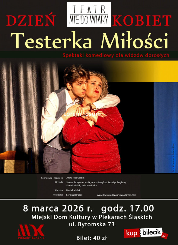 "Testerka miłości" to komedia, na którą 8 marca zaprasza Miejski Dom Kultury w Piekarach Śląskich (ul. Bytomska 73). Początek o godz. 17, bilety kosztują 40 zł.