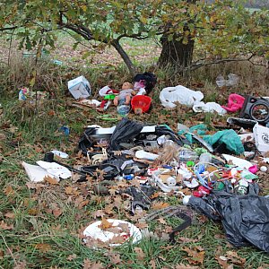 Na dzikim śmietnisku znajdującym się mniej więcej w połowie drogi leżą zepsute zabawki, materace, talerz z zaschniętym sosem, plastikowe butelki, tekturowe opakowania po czajniku i pizzy, obuwie dziecięce. Wśród śmieci można zauważyć nieotwarte opakowanie podpłomyków i worek na odpady papierowe. Krótko mówiąc, ktoś zadał sobie trud wywiezienia w pole śmieci, które w większości mógł po prostu wrzucić do kontenera. Nie mówiąc już o ich posegregowaniu. Prawdopodobnie śmieci wyrzucono w weekend.