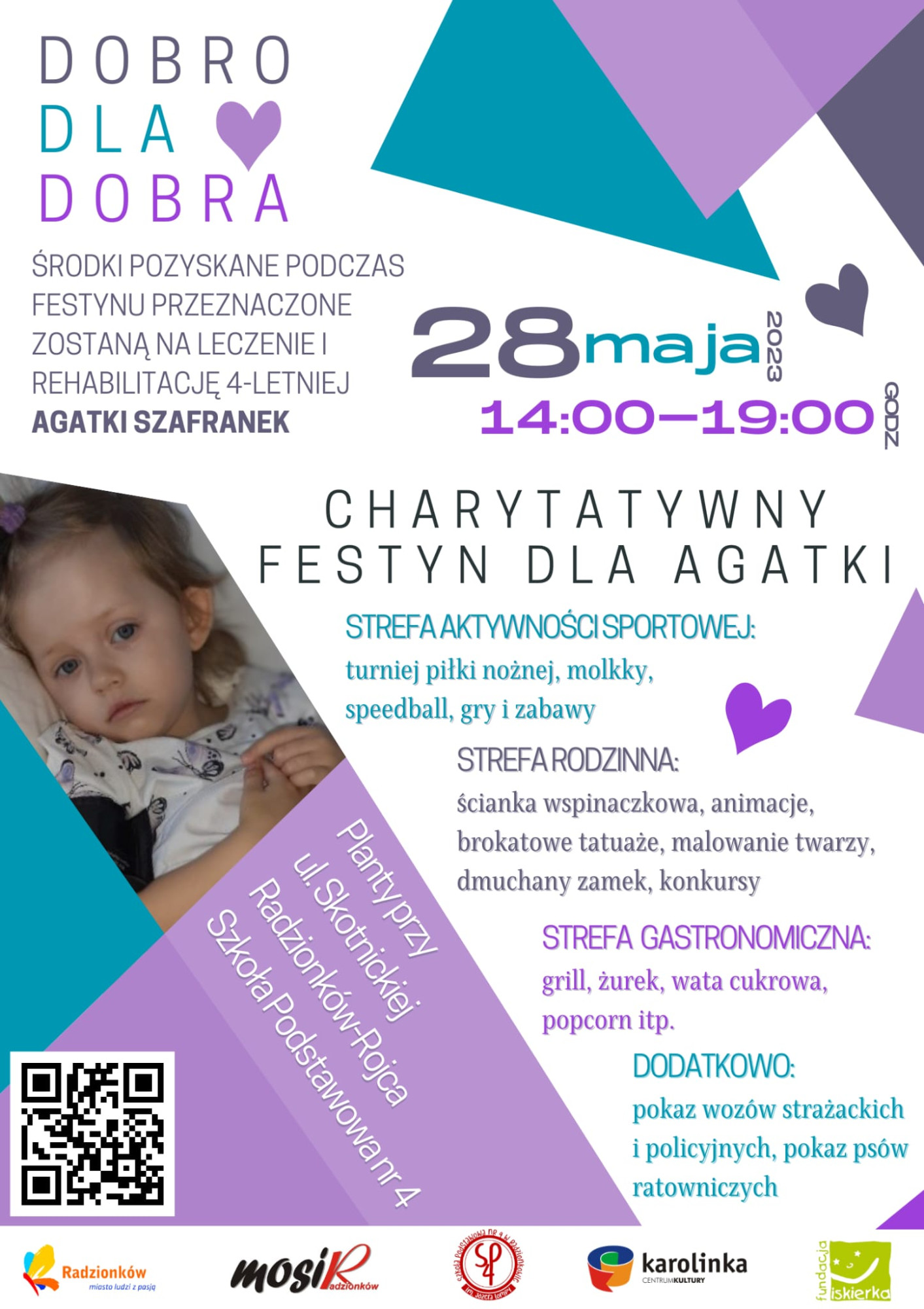 W niedzielę, 28 maja, na plantach w Radzionkowie-Rojcy odbędzie się festyn charytatywny, którego celem będzie zebranie pieniędzy na pomoc w powrocie do zdrowia dziewczynki. W organizację włączyły się Miejski Ośrodek Sportu i Rekreacji w Radzionkowie, Centrum Kultury Karolinka, miasto Radzionków, Szkoła Podstawowa nr 4 im. J. Lompy i Fundacja Iskierka, której dziewczynka jest podopieczną.