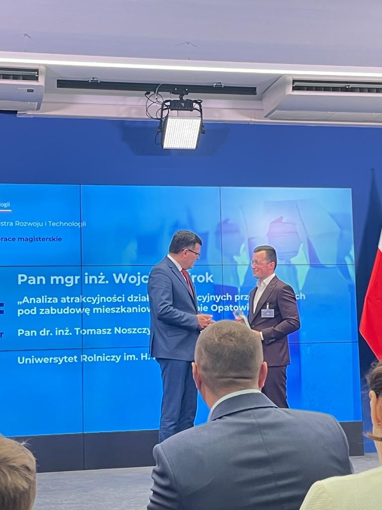 Praca dyplomowa Wojciecha Kroka "Analiza atrakcyjności działek ewidencyjnych przeznaczonych pod zabudowę mieszkaniową w obrębie Opatowic" była jedną z trzech, które zdobyły nagrodę. Wojciech Krok studiował na Uniwersytecie Rolniczym im. H. Kołłątaja w Krakowie, na Wydziale Inżynierii Środowiska i Geodezji. Jego promotorem był dr. inż. Tomasz Noszczyk prof. URK.