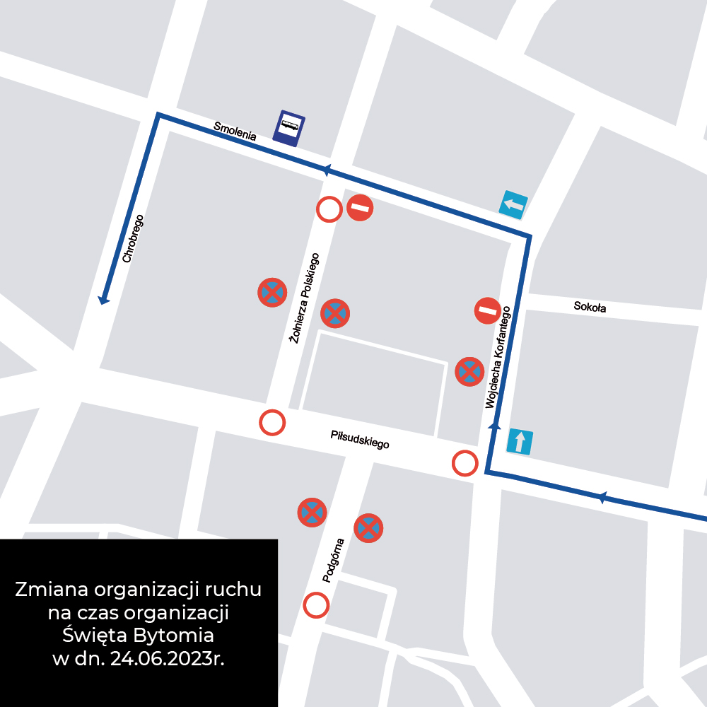 W nocy z piątku na sobotę (23 na 24 czerwca) zamknięta dla zostanie ul. Piłsudskiego na odcinku od skrzyżowania z ul. Korfantego do ul. Żołnierza Polskiego. Wyłączone z ruchu będą także ulice przyległe (ul. Podgórna na odcinku od ul. Piłsudskiego do pl. Grunwaldzkiego oraz ul. Żołnierza Polskiego na odcinku od ul. Piłsudskiego do ul. Smolenia).