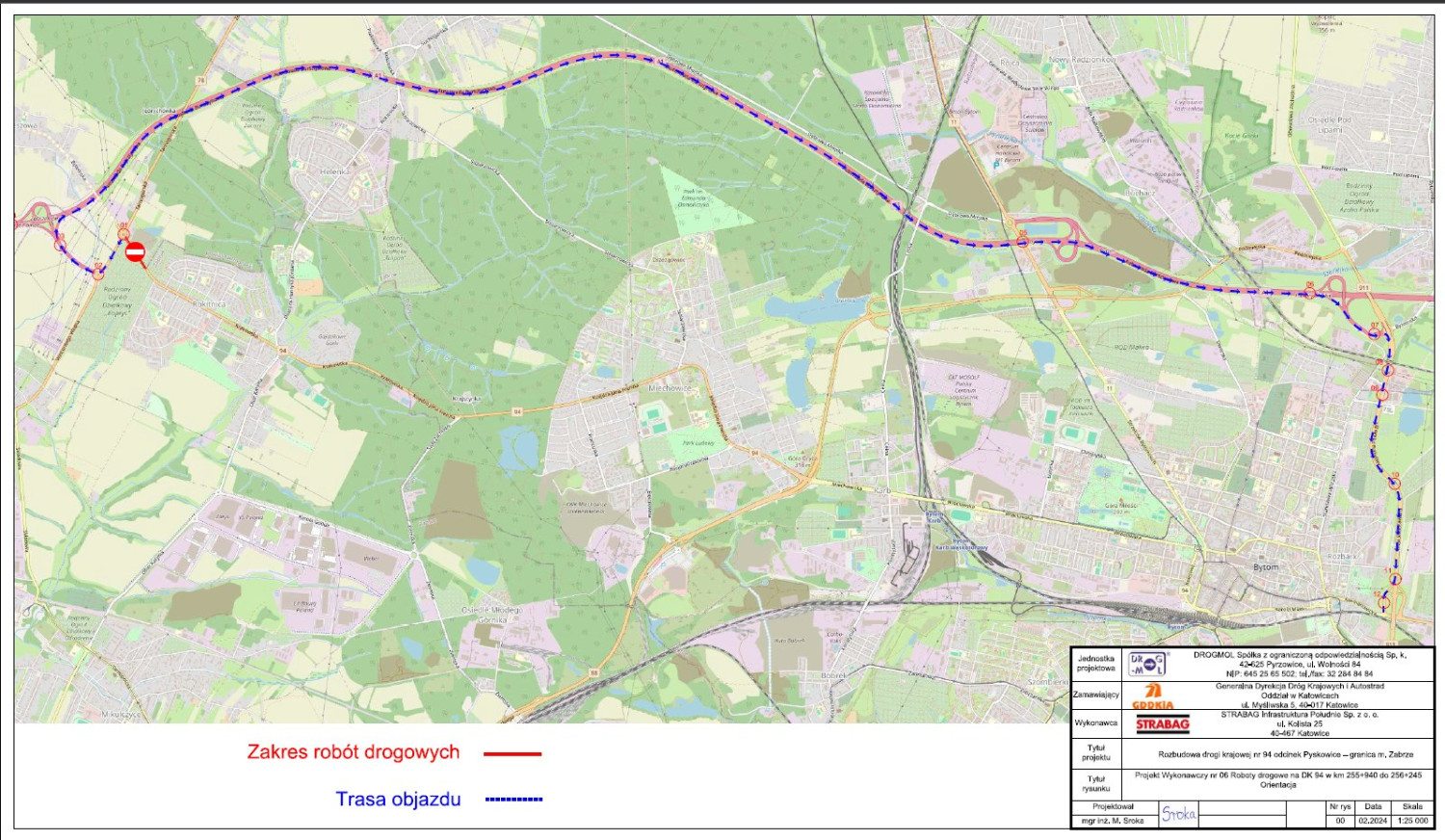 Wykonawca prowadzi prace na 300-metrowym odcinku DK 94 od ronda w Wieszowie aż do granicy Zabrza. Zamknięty został zjazd w kierunku Rokitnicy.