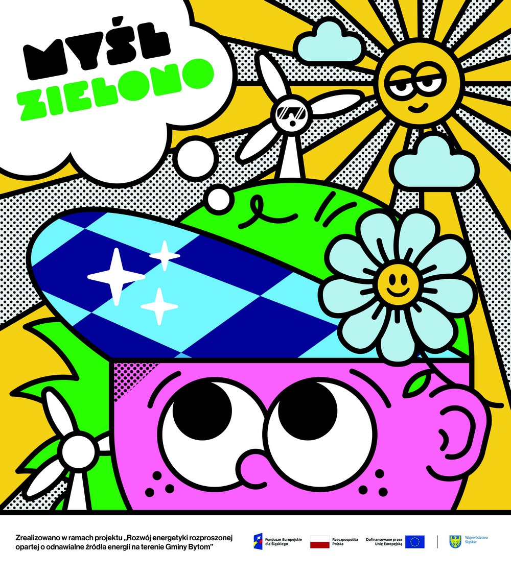 „Myśl zielono” to projekt w stylu komiksowym, gdzie daszek w czapce pełni funkcję paneli fotowoltaicznych, a wiatraczek zmienia się w turbinę wiatrową. Jak mówi twórca, mural jest punktem wyjścia do rozmów o ochronie środowiska.