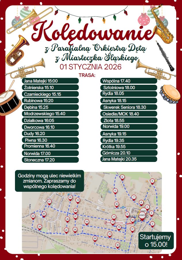 Orkiestra Reprezentacyjna Gminy Miasteczko Śląskie z Parafialną Orkiestrą Dętą zapraszają mieszkańców na kolędowanie.