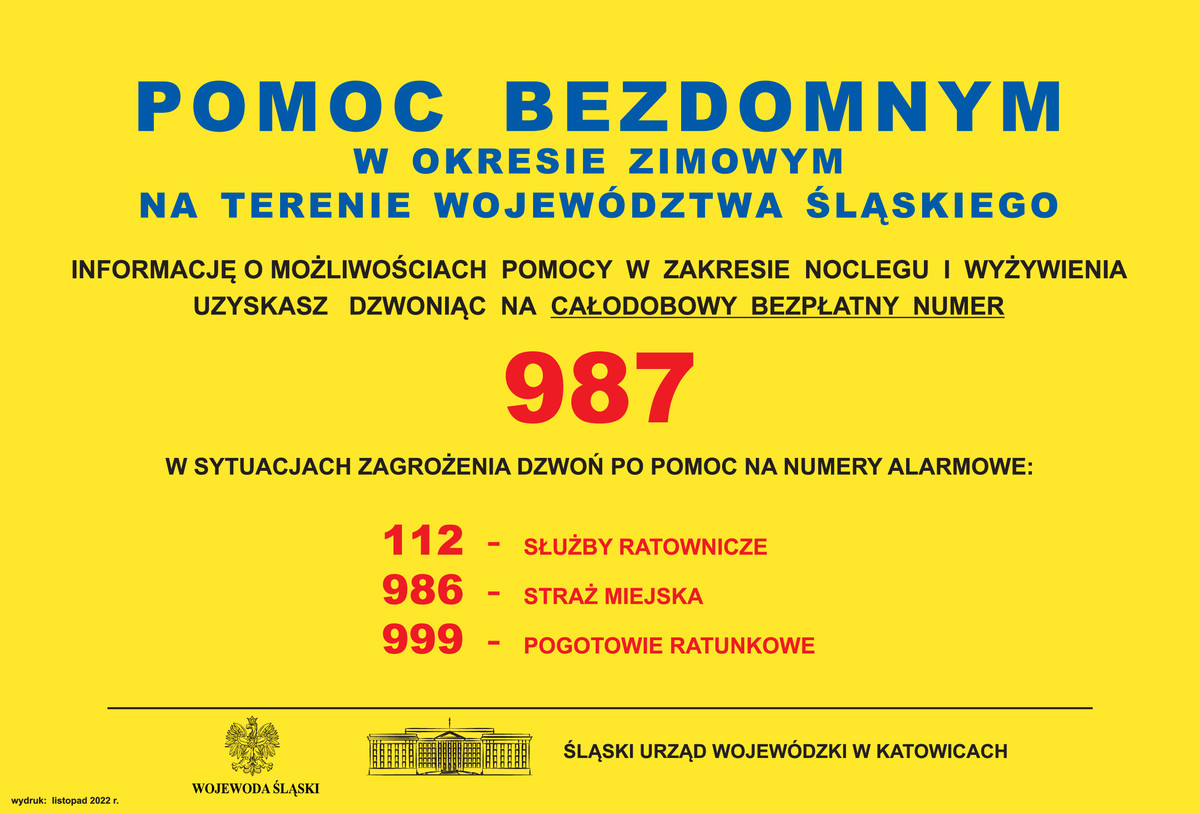 Od 1 listopada do 31 marca działa specjalna, całodobowa infolinia - pod numerem telefonu 987 można uzyskać informację o możliwości pomocy dla osób bezdomnych.