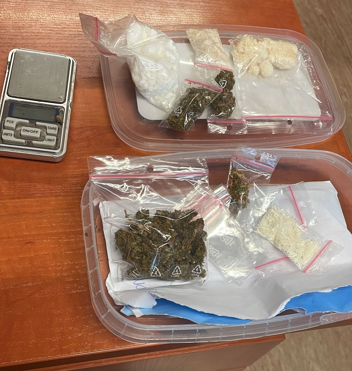 Była to spora ilość białego proszku, suszu roślinnego oraz waga jubilerska. 25-latek wylądował na komendzie.