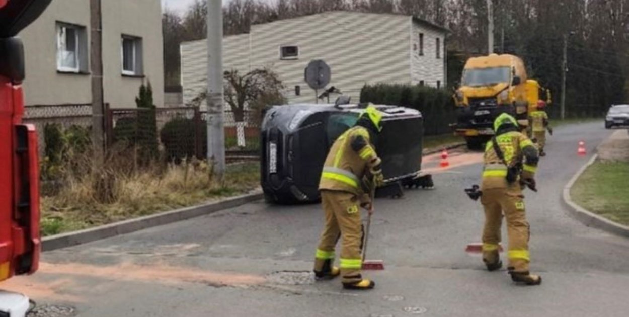 Auto sprawcy przewróciło się na bok. Mimo uszkodzeń i stresu, wszyscy uczestnicy kolizji mogą mówić o sporym szczęściu. Żaden z kierowców nie wymagał pomocy medycznej.