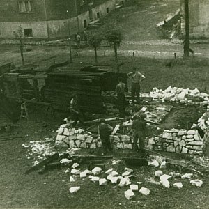 W lutym 1955 r. członkowie Stowarzyszenia rozpoczęli demontaż dzwonnicy. Później w częściach przetransportowali ją do centrum miasta. Wykorzystali do tego traktor z przyczepą. Prace związane z budową kamiennego cokołu rozpoczęły się dopiero na początku lipca. Wydarzenie to opisywała Trybuna Robotnicza. Drewnianą konstrukcję rozpoczęto ustawiać 16 lipca. Oficjalnie dzwonnica stanęła na Placu Gwarków 22 lipca 1955 r., w miejscu gdzie znajdowała się wcześniej chata gwarecka.