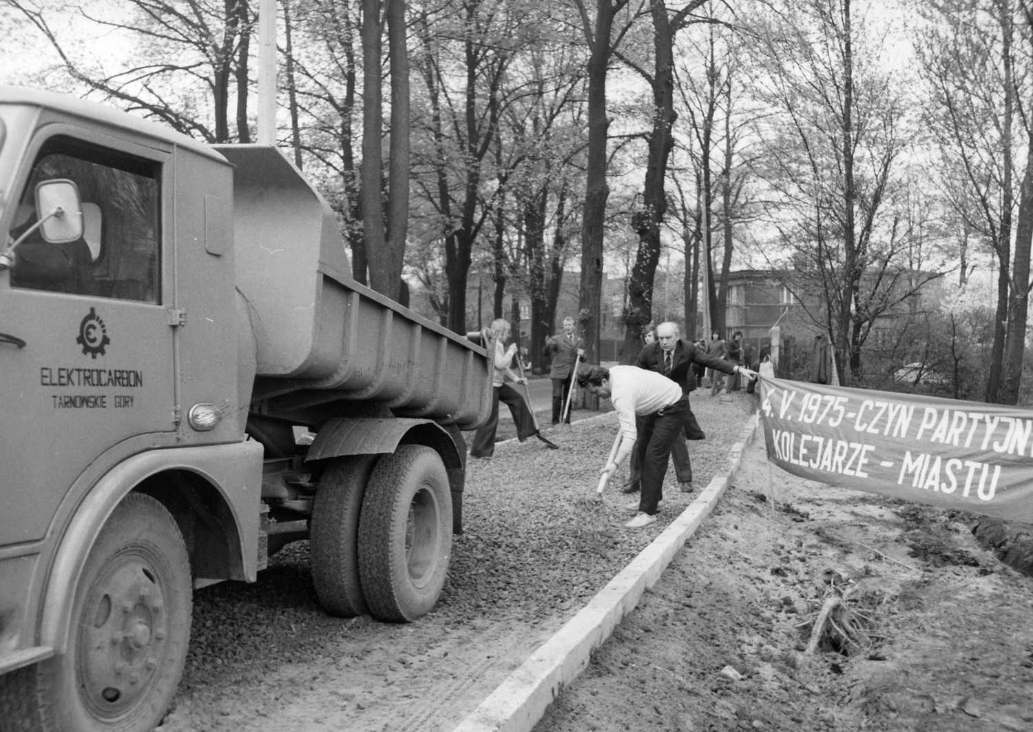 100 tarnogórskich kolejarzy, z okazji Dnia czynu partyjnego pracowało przy budowie chodnika na ul. Częstochowskiej. Sprzęt zapewniły miejscowe zakłady przemysłowe. Zdjęcie ukazało się w Gwarku z 14 maja 1975 r.