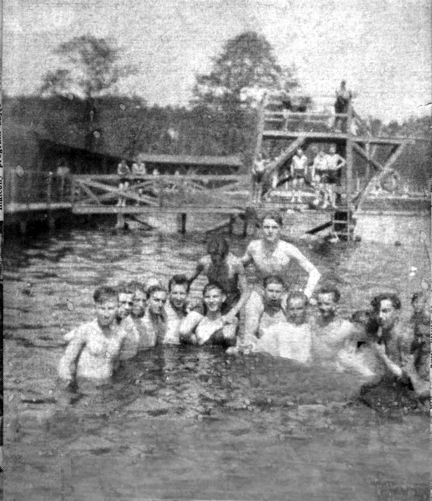 Właściciel Żabich Stawów pokazuje fotografię: w wodzie grupa chłopców pozujących do zdjęcia, w tle widać drewniany pomost i wysoką na jakieś 3 metry wieżę do skoków, a nieco dalej drewniane baraki. Na odwrocie fotografii skreślone odręcznie słowa: "Rok 1931, upalne dni majowe, podczas których całe Gimn. szukało chłodu w łaźni miejskiej".